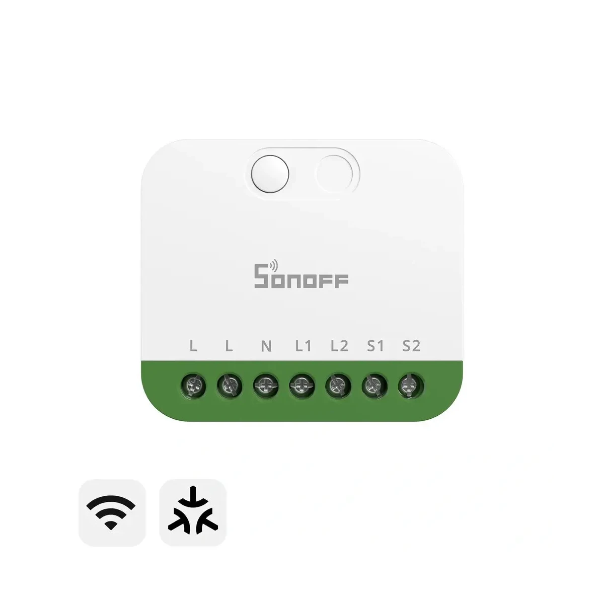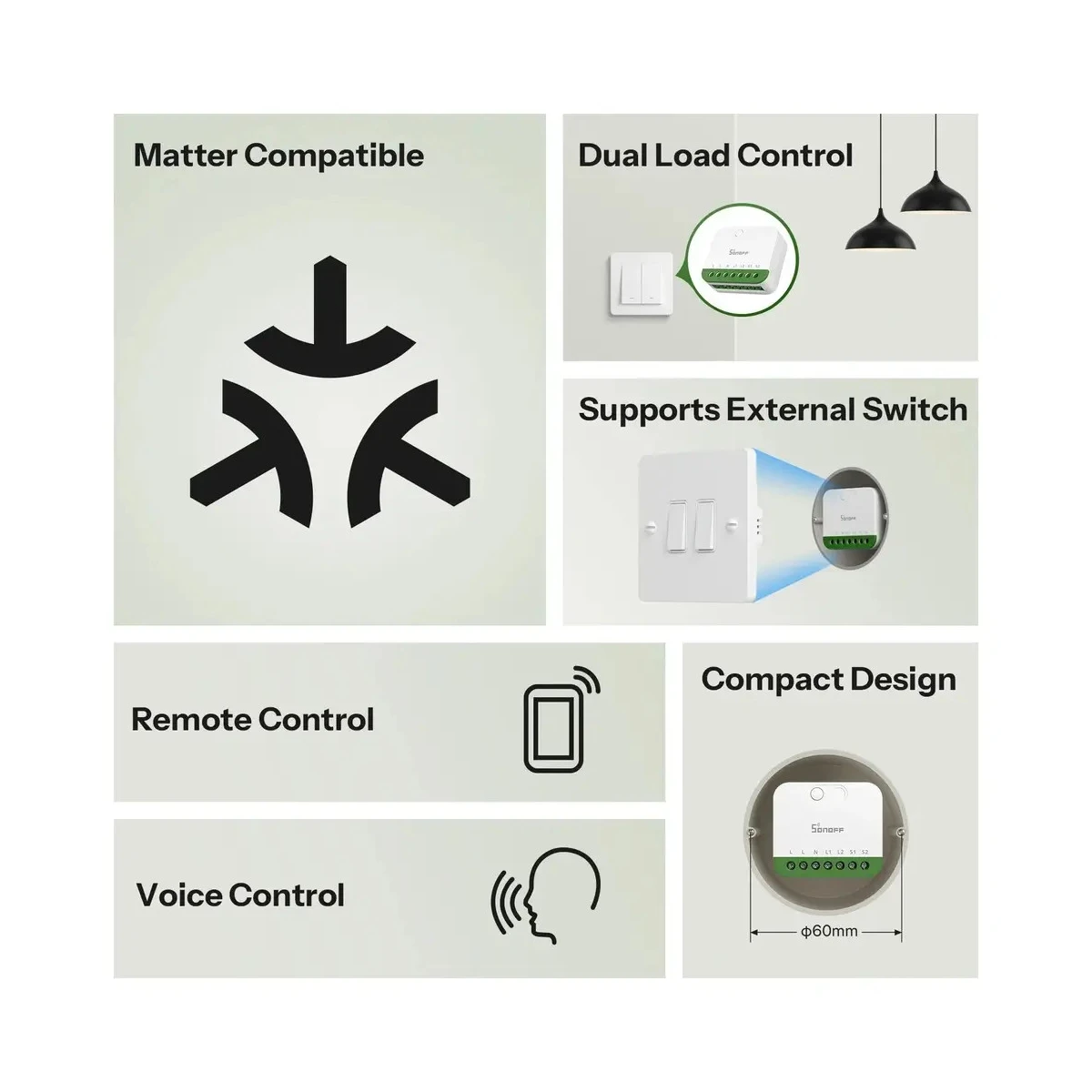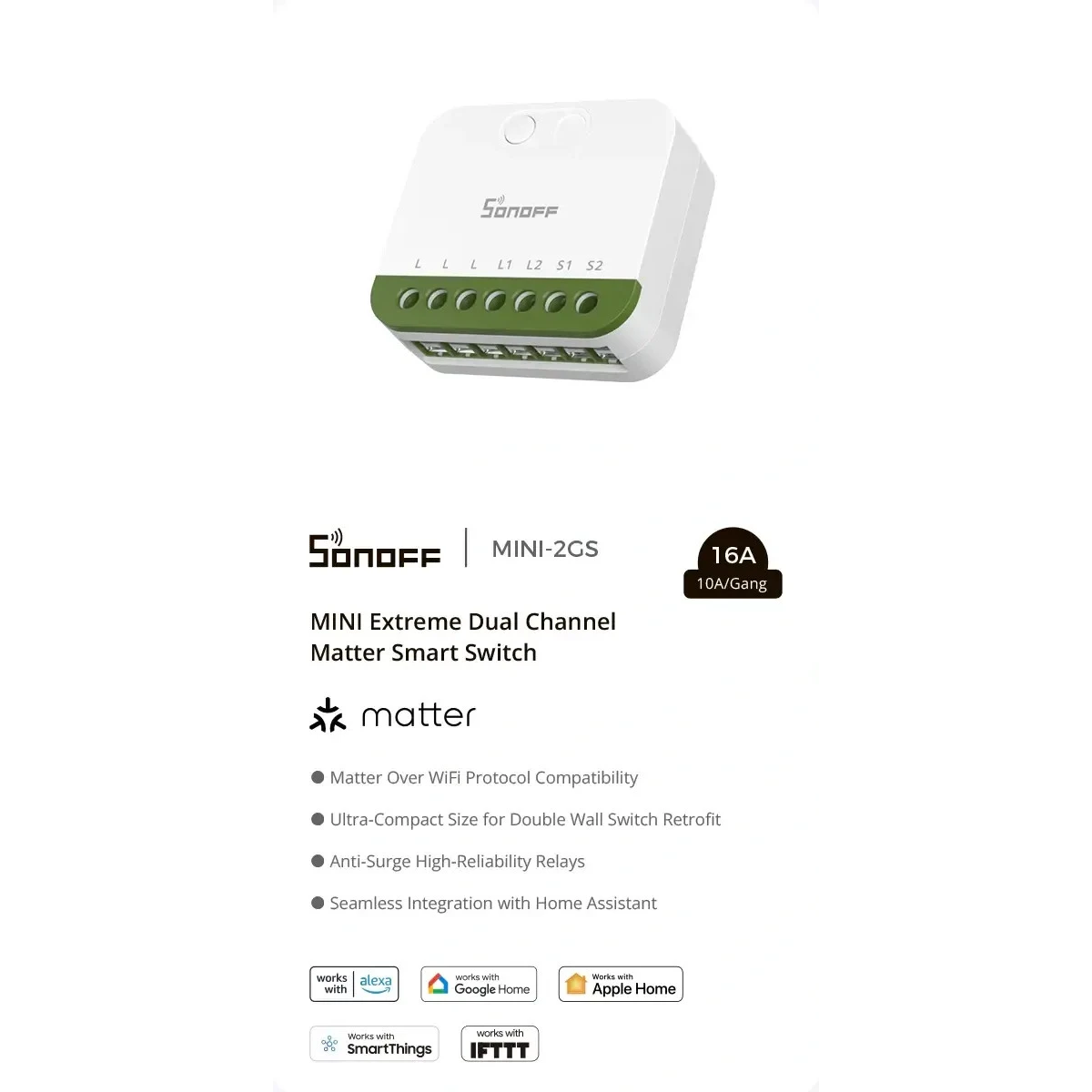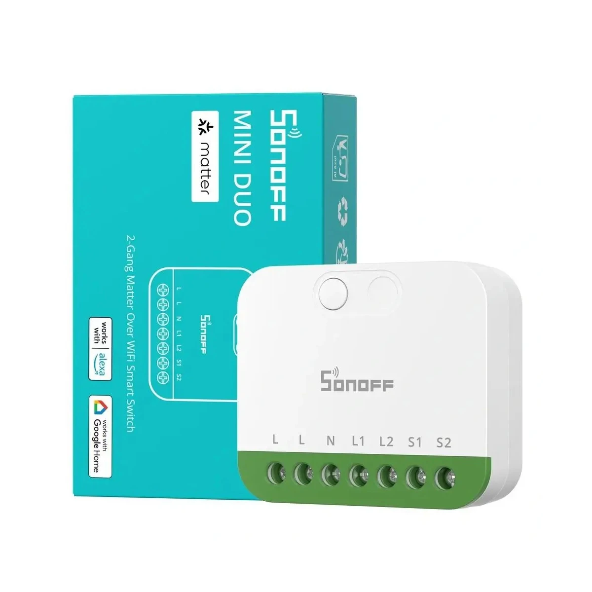 The SONOFF MINI DUO 2-Gang Matter Over WiFi Smart Switch (MINI-2GS) turns a standard wall switch into a compact dual-channel smart hub for your lights and appliances. Thanks to Matter over Wi-Fi, it connects effortlessly to Apple Home, Google Home, Amazon Alexa and Home Assistant, giving you unified, future-proof smart home control in one discreet module hidden in the wall box.