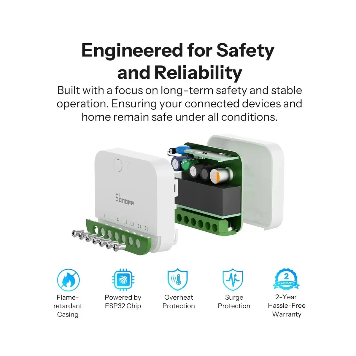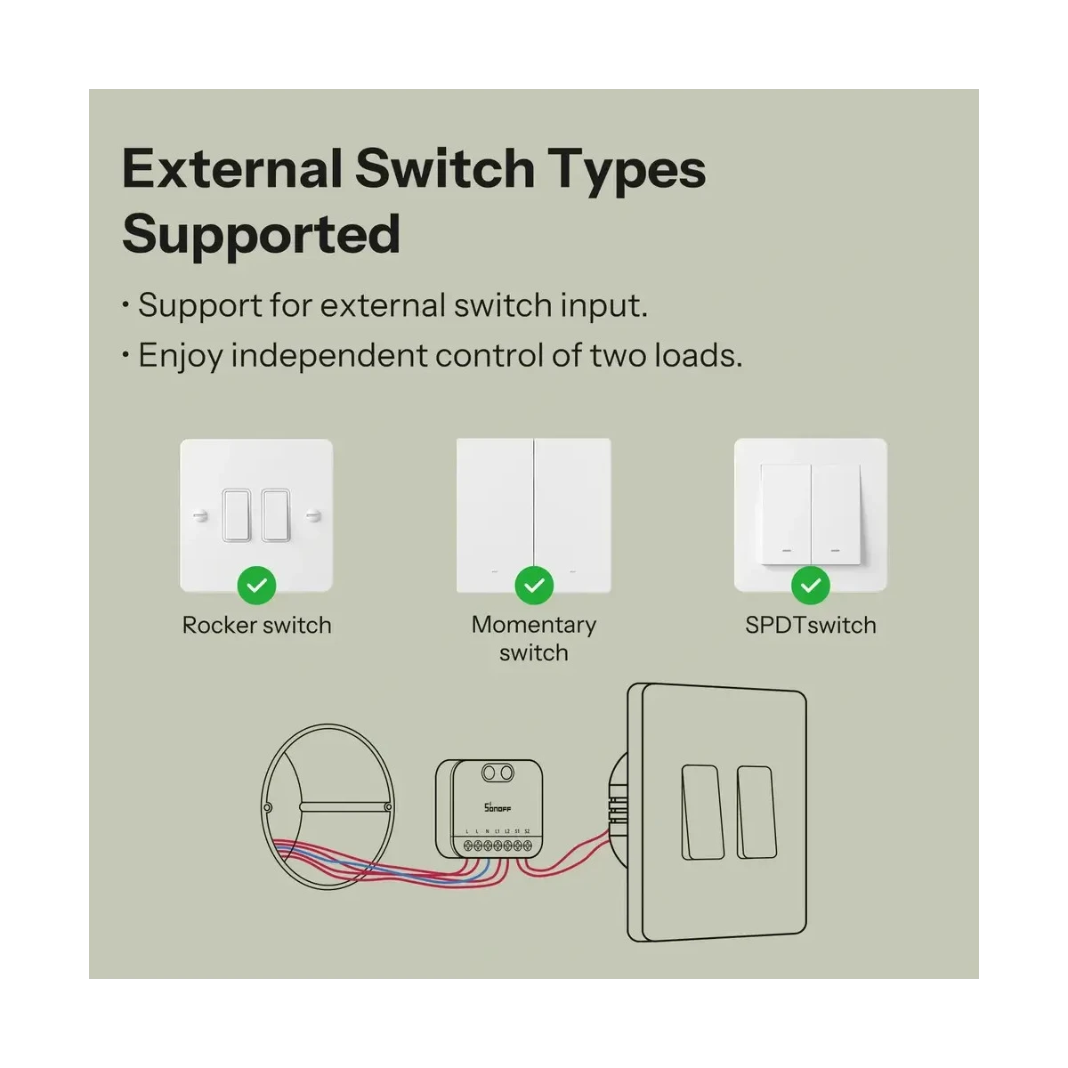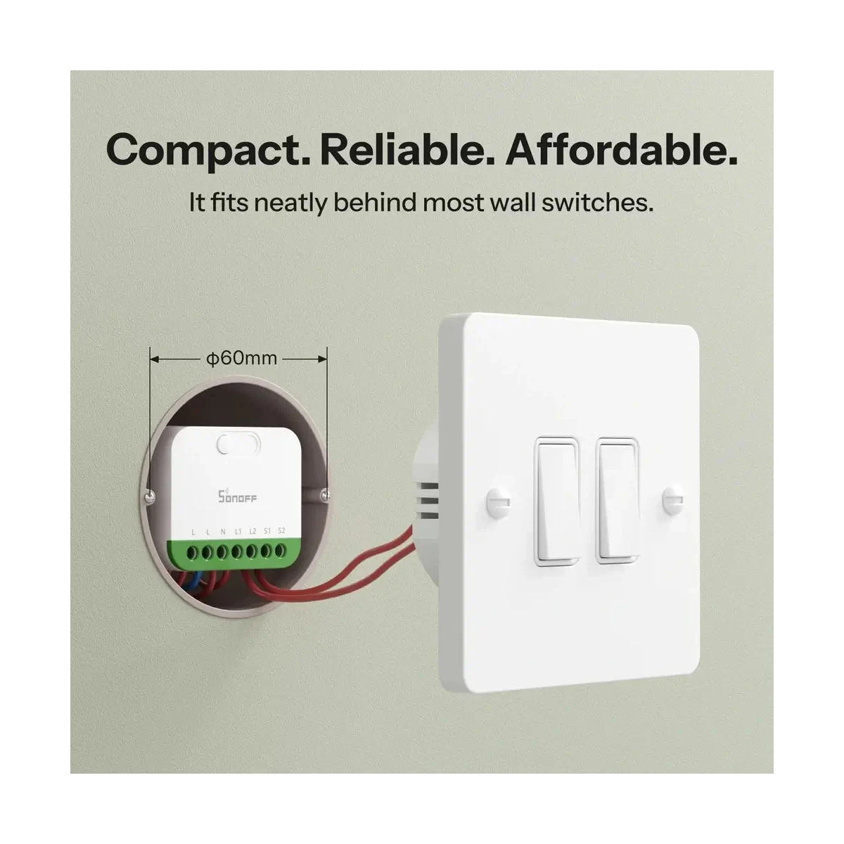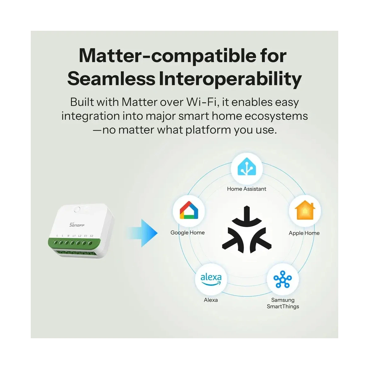 The SONOFF MINI DUO 2-Gang Matter Over WiFi Smart Switch (MINI-2GS) turns a standard wall switch into a compact dual-channel smart hub for your lights and appliances. Thanks to Matter over Wi-Fi, it connects effortlessly to Apple Home, Google Home, Amazon Alexa and Home Assistant, giving you unified, future-proof smart home control in one discreet module hidden in the wall box.