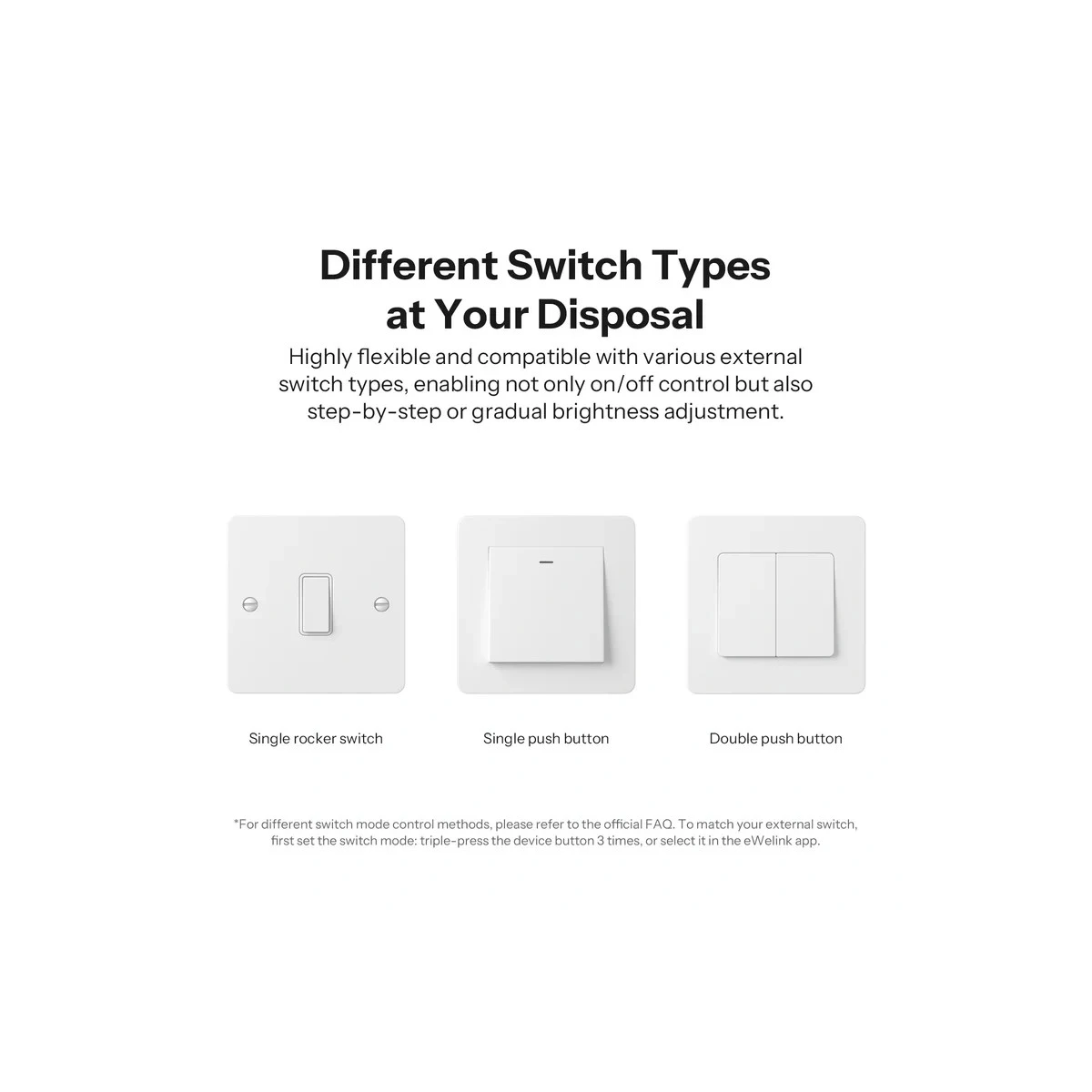 Keep your familiar wall controls: MINI-DIM supports two external switches (momentary or rocker) controlling the same light from two locations—ideal for hallways or staircases. Add smart timers, delayed actions, recurring schedules, and “night light” routines so your home lighting follows your daily rhythm.