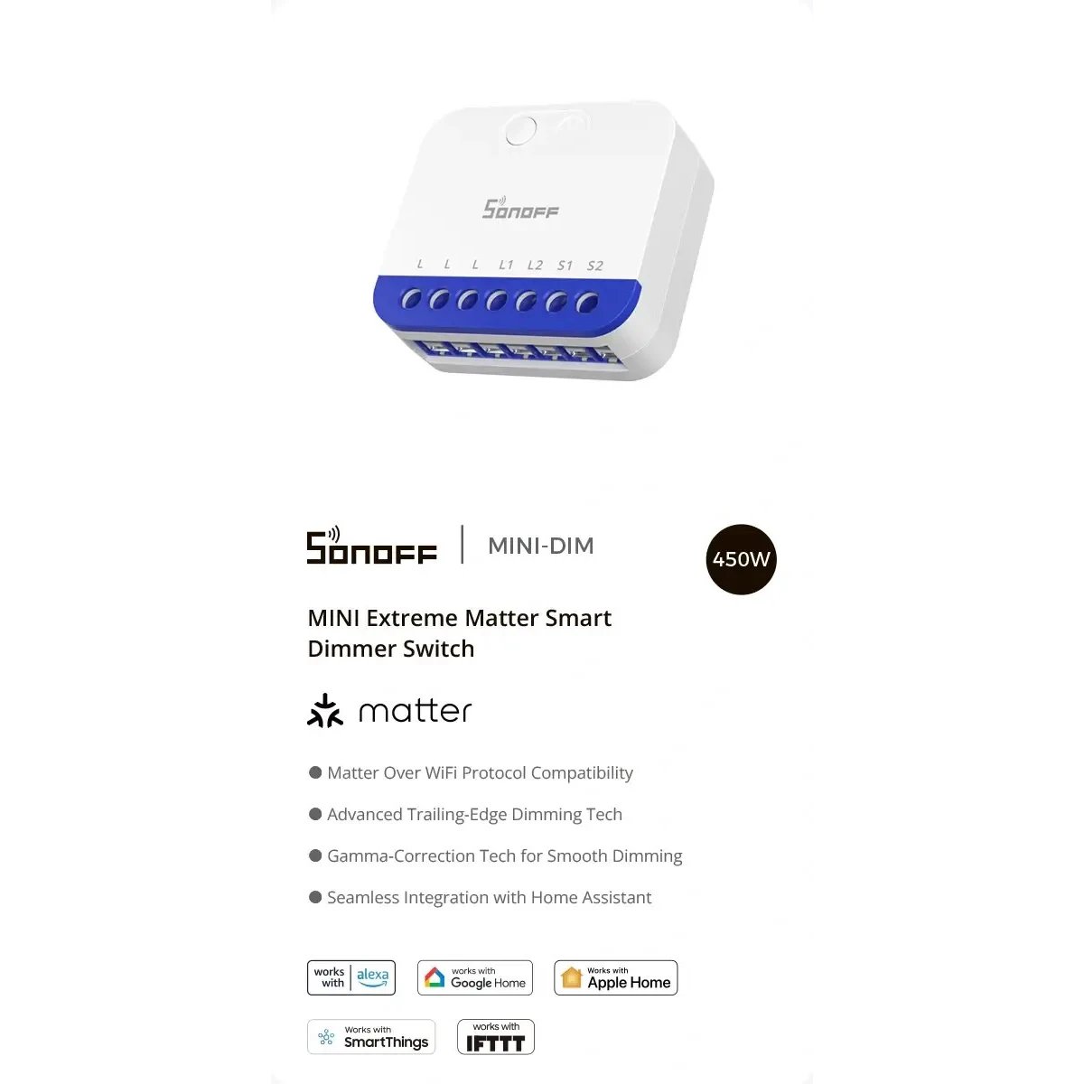 If you want ON/OFF Matter over Wi-Fi without dimming for another circuit, consider the compact SONOFF switch module MINIR4M (Matter-enabled). Prefer Zigbee dimming? Check SONOFF MINI-ZBDIM.