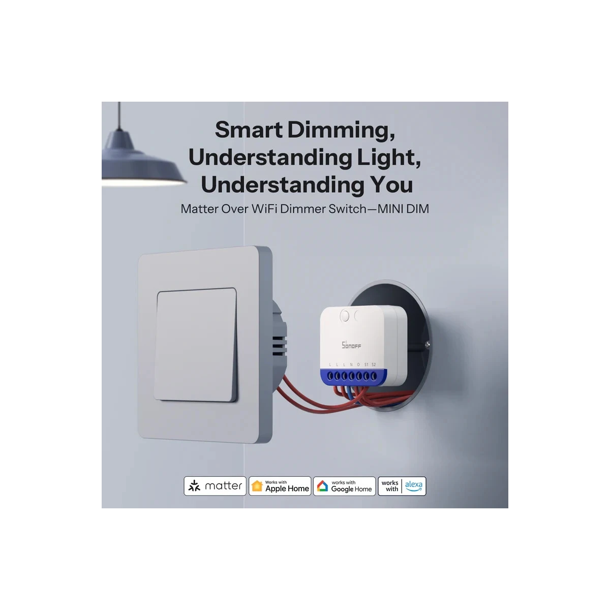 Turn a standard 220–240 V lighting circuit into a modern Matter over Wi-Fi smart dimmer switch with the SONOFF MINI-DIM. Hidden behind your wall switch, MINI-DIM brings flicker-free LED dimming, voice control, automations, and real-time power monitoring—all in a compact “MINI Extreme” form factor.