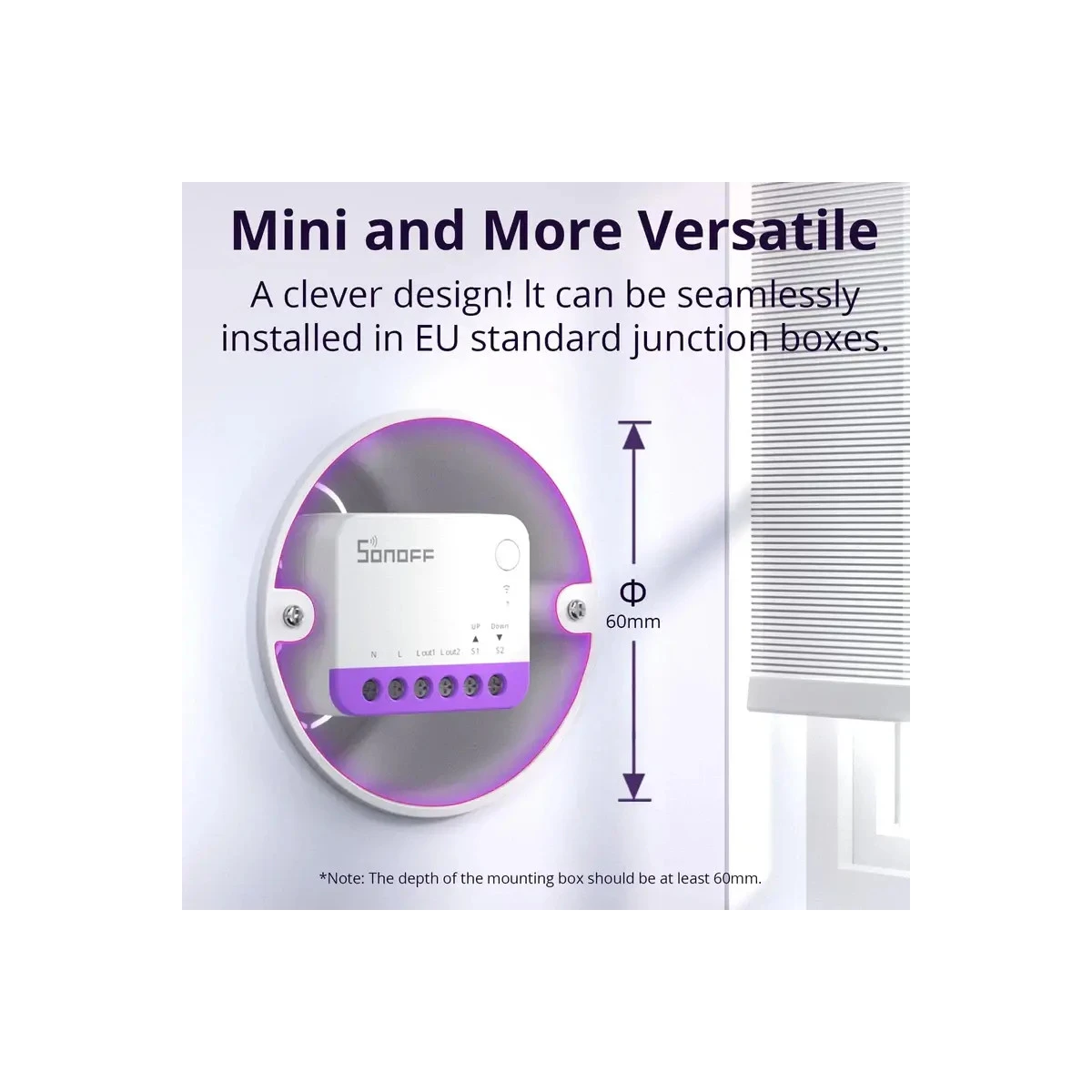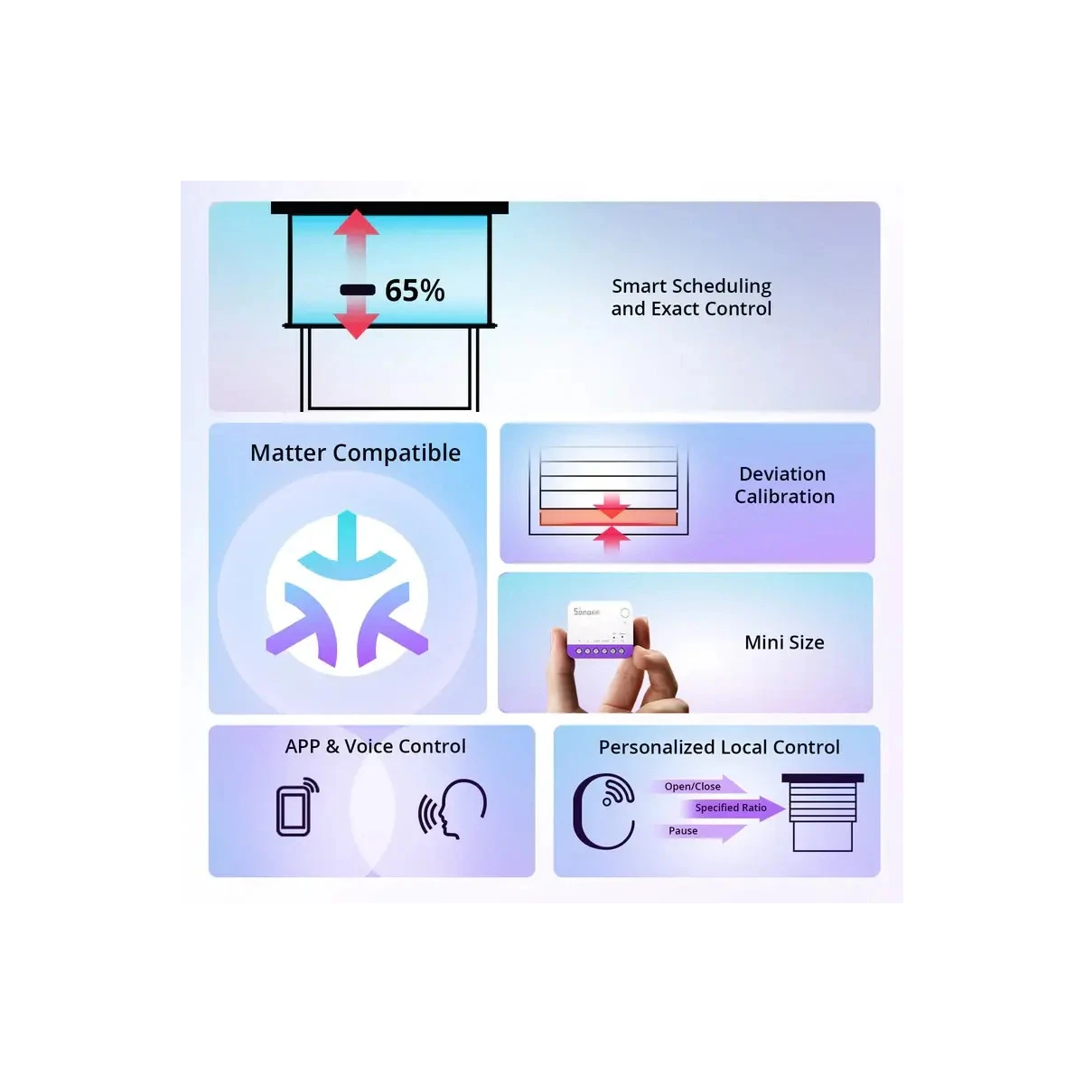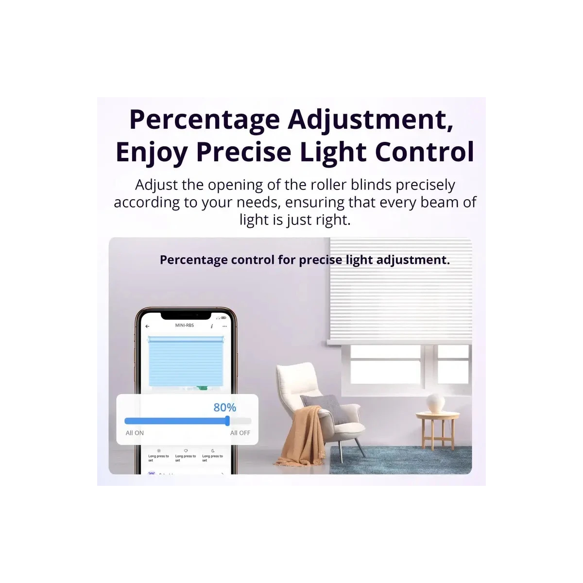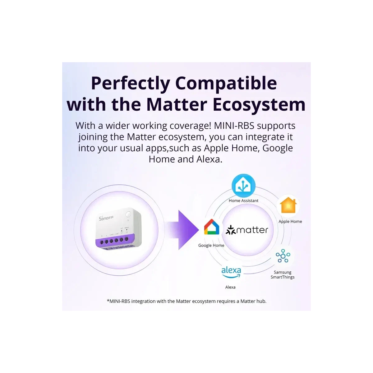 SONOFF MINI-RBS Wi-Fi Smart Roller Shutter Switch — Precise Light Control. Upgrade roller blinds with percentage-accurate positioning in a compact module for EU 60 mm boxes. Get fast local control, app access, and wide platform support. Precise control: Set exact open/close percentages. Mini size: Fits small wall junction boxes. Matter compatible*: Apple Home, Google Home, Alexa. Schedules: Automate open/close by time. Calibration: Corrects drift and extends motor life. Specs: 100–240 V~, max. 1 A motor, 2.4 GHz Wi-Fi. *Requires a Matter hub.