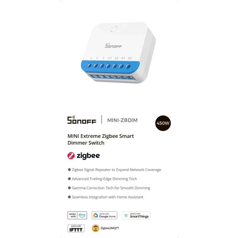SONOFF MINI-ZBDIM is a compact in-wall Zigbee 3.0 dimmer switch built for modern homes that want flicker-free LED dimming, real-time energy insights, and rock-solid automation. Hide it behind your existing wall switch and control your lights via app, scenes, schedules, or voice (via your hub) while keeping everyday switching intuitive.